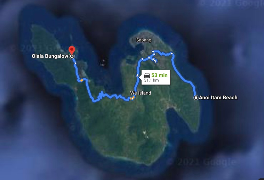 Berikut kira-kira rute lama perjalanan darin Pantai Anoi Itam menuju Kampung Iboih.