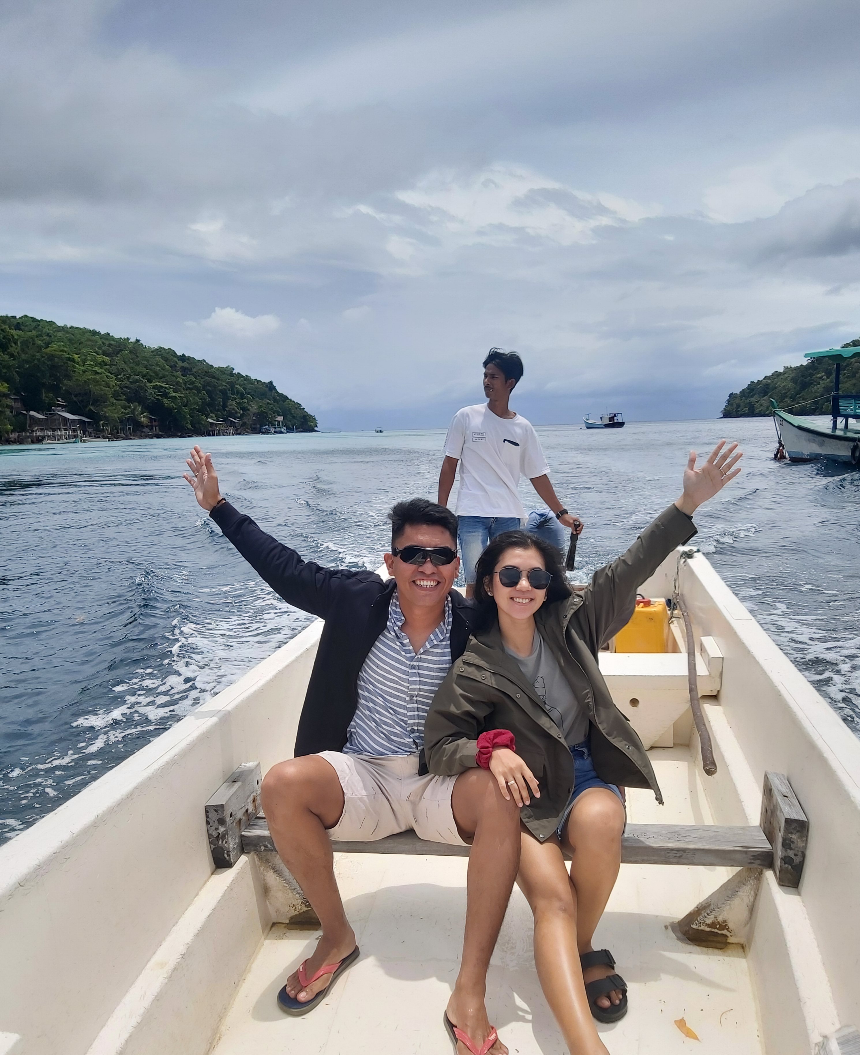 Kami akhirnya berangkat dengan menaiki Kapal Cepat alias kapal feri versi kecil. Harga tiket kapal sebesar Rp.100.000,- per orang. Lama penyeberangan dari Banda Aceh ke Pulau Sabang sekitar 1 jam. Hari itu cuaca betul-betul sangat bagus. Sangat pas untuk berfoto diatas kapal.